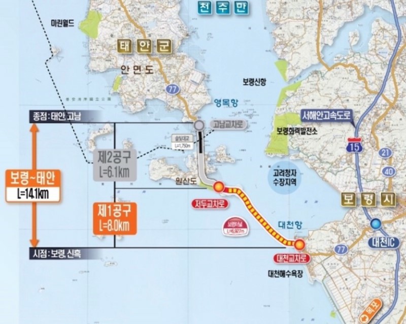오늘은 이곳은 국도77호 태안 안면도~원산도~보령을 연결하는 연륙교와 해저터널 공사구간중 다리공사가 완공되어 공사시작 9년만에 공식 개통하는 날입니다.