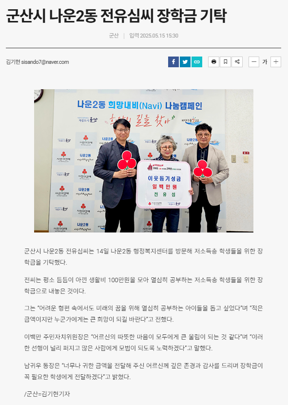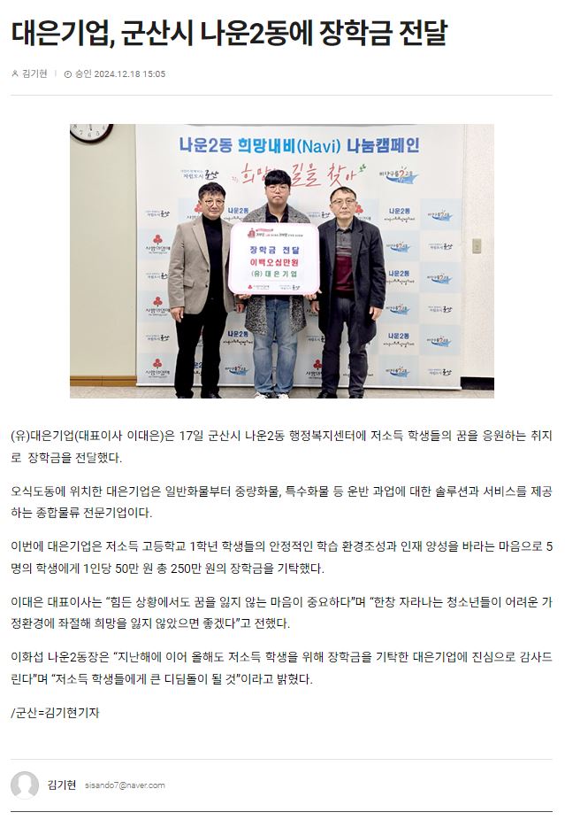 | 343 | 대은기업, 군산시 나운2동에 장학금 전달 |