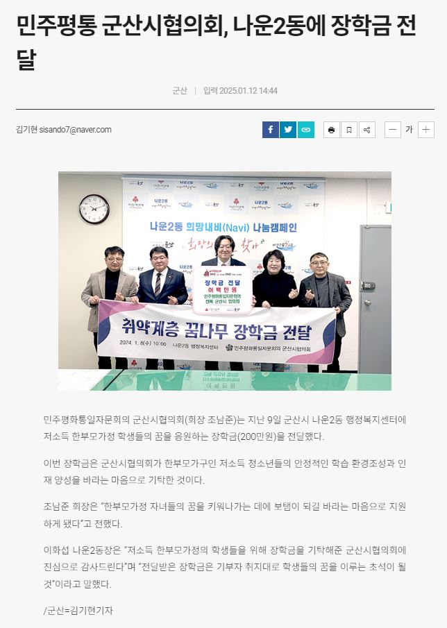 | 344 | 민주평화통일자문회의 군산시 협의회, 나운2동에 장학금 전달 |