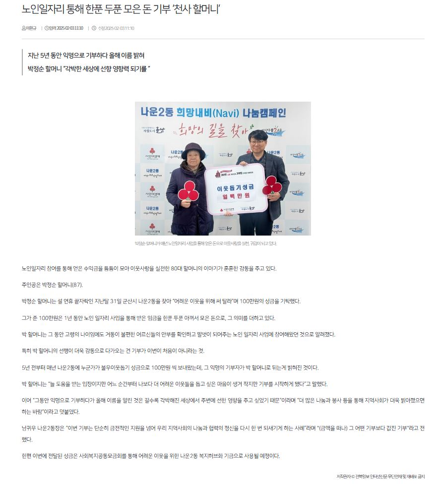 | 346 | 박정순 어르신, 이웃돕기 성금 100만원 기부 |