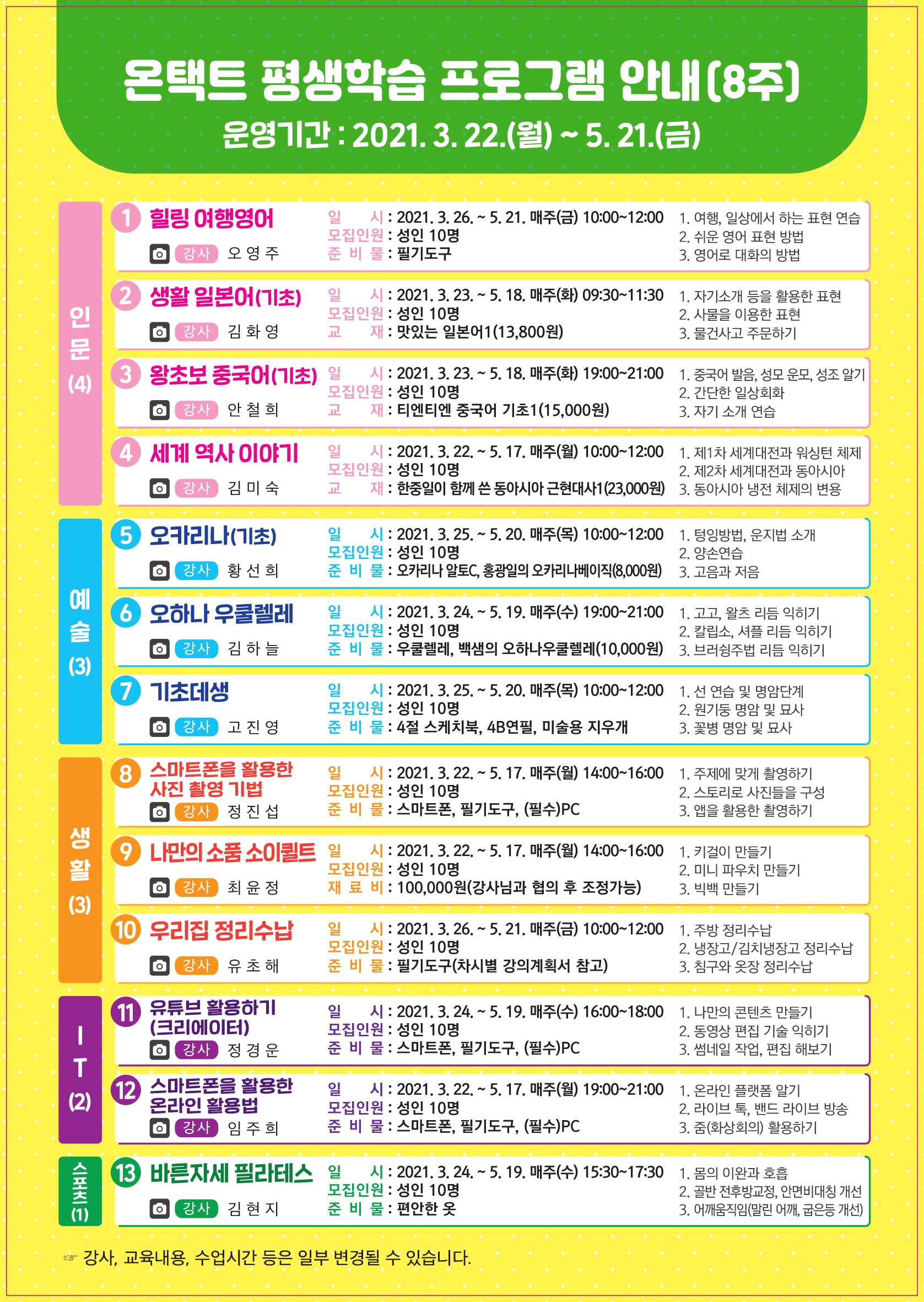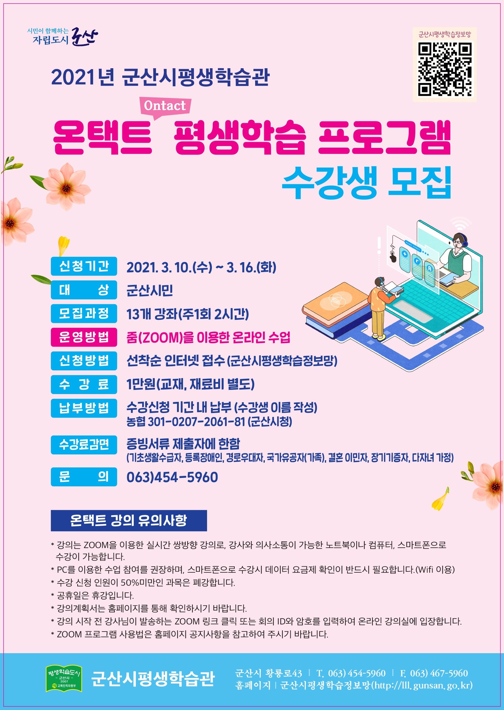 군산시평생학습관에서는 비대면 학습에 적응하고 새로운 평생학습 컨텐츠 활성화를 위하여 2021년 온택트 평생학습 프로그램 수강생을 다음과 같이 모집하고자 하오니 시민들에게 홍보와 안내를 부탁드립니다.