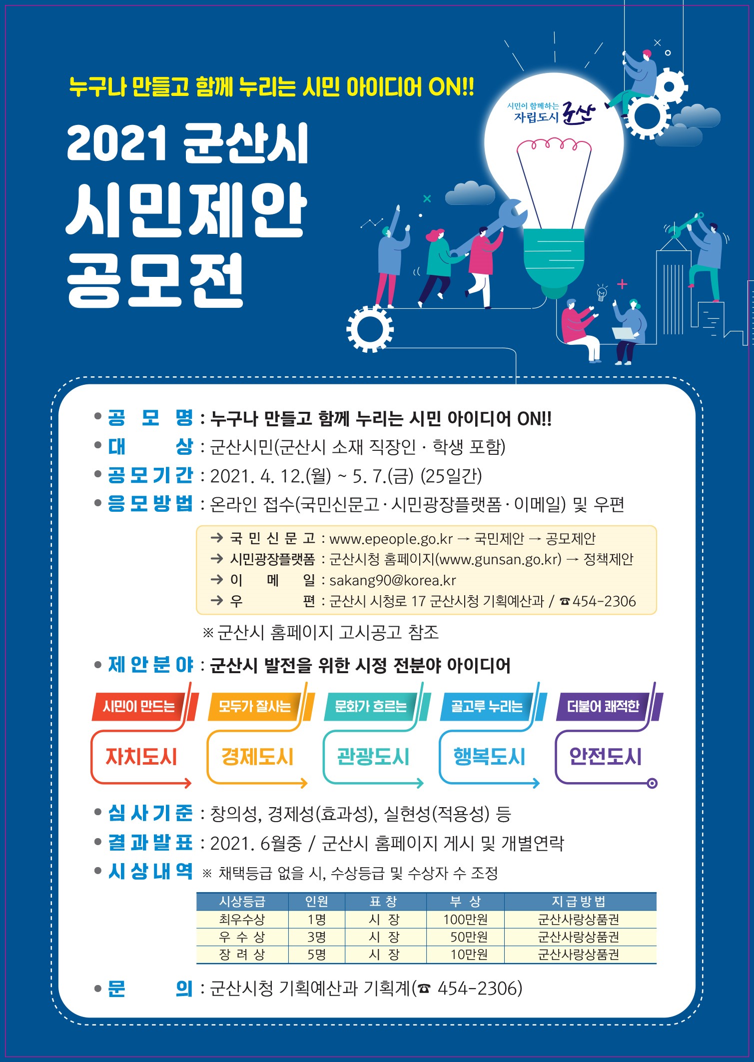 ○ 공 모 명 : 누구나 만들고 함께 누리는 시민 아이디어 ON!! ○ 접수기간 : 2021. 4. 12.(월) ~ 5. 7.(금) ○ 응모자격 : 군산 시민 누구나(군산시 소재 직장인ㆍ학생 포함) ○ 제안분야 : 군산시 발전을 위한 시정 전 분야 아이디어 ○ 응모방법 : 온라인 접수(국민신문고ㆍ시민광장플랫폼ㆍ이메일) 및 우편 ○ 시상내역 : 최우수 100만원[1명], 우수 50만원[3명], 장려 10만원[5명] ○ 문 의 처 : 군산시 기획예산과 기획계 ☎ 063)454-2306 ※ 기타 자세한 내용은 군산시 공고문 참조 | ||