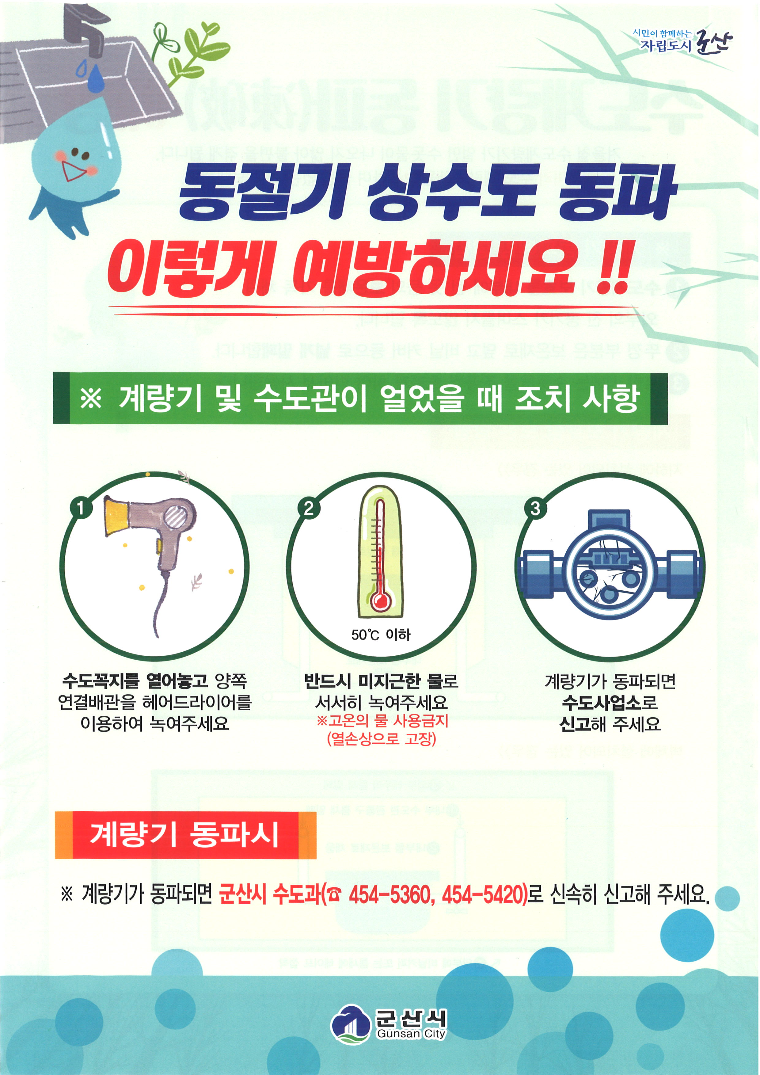 ❍ 만약 수도계량기가 동파되었을 때는 시청 수도과로 신고 [☎454-5360, 5420]