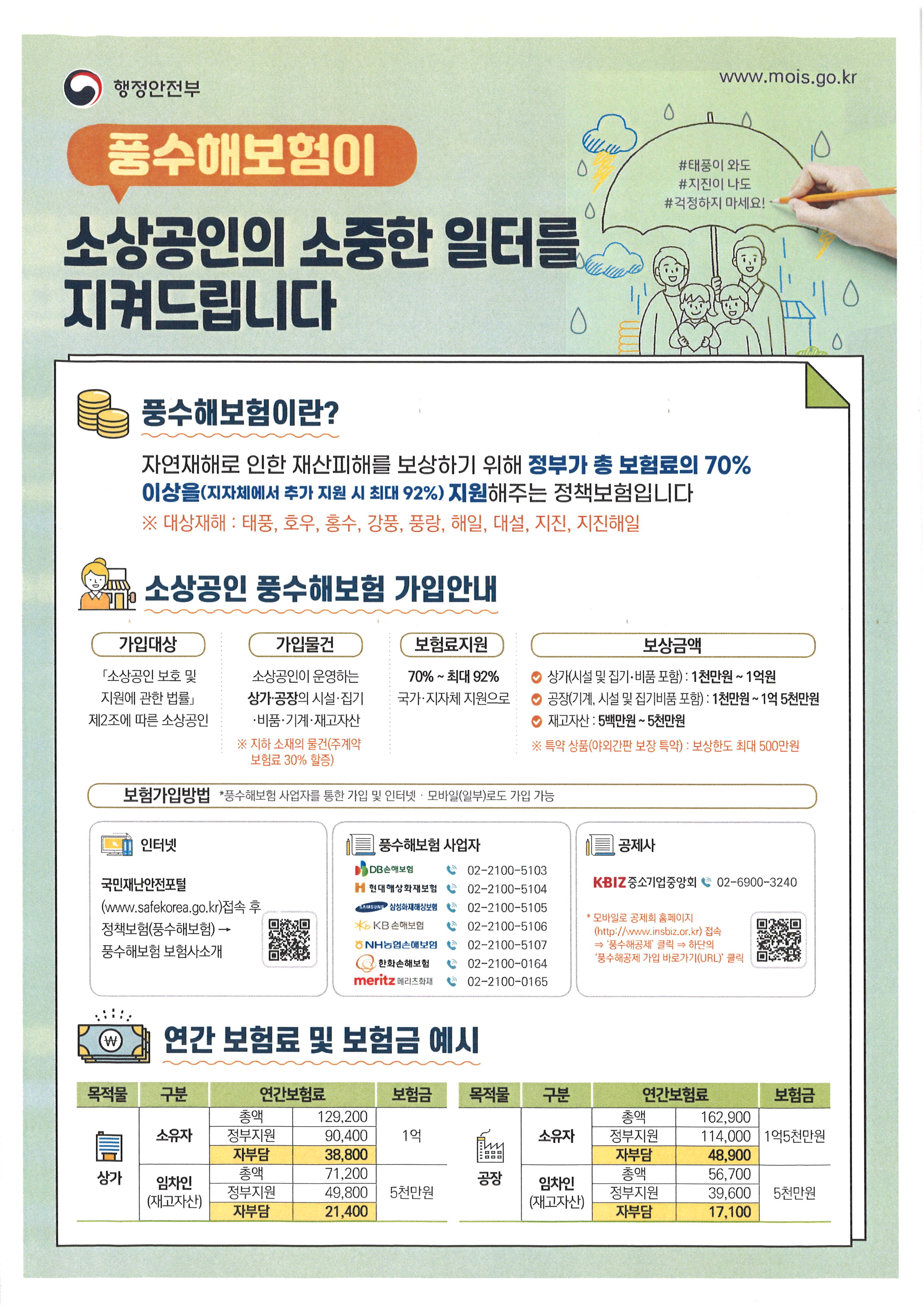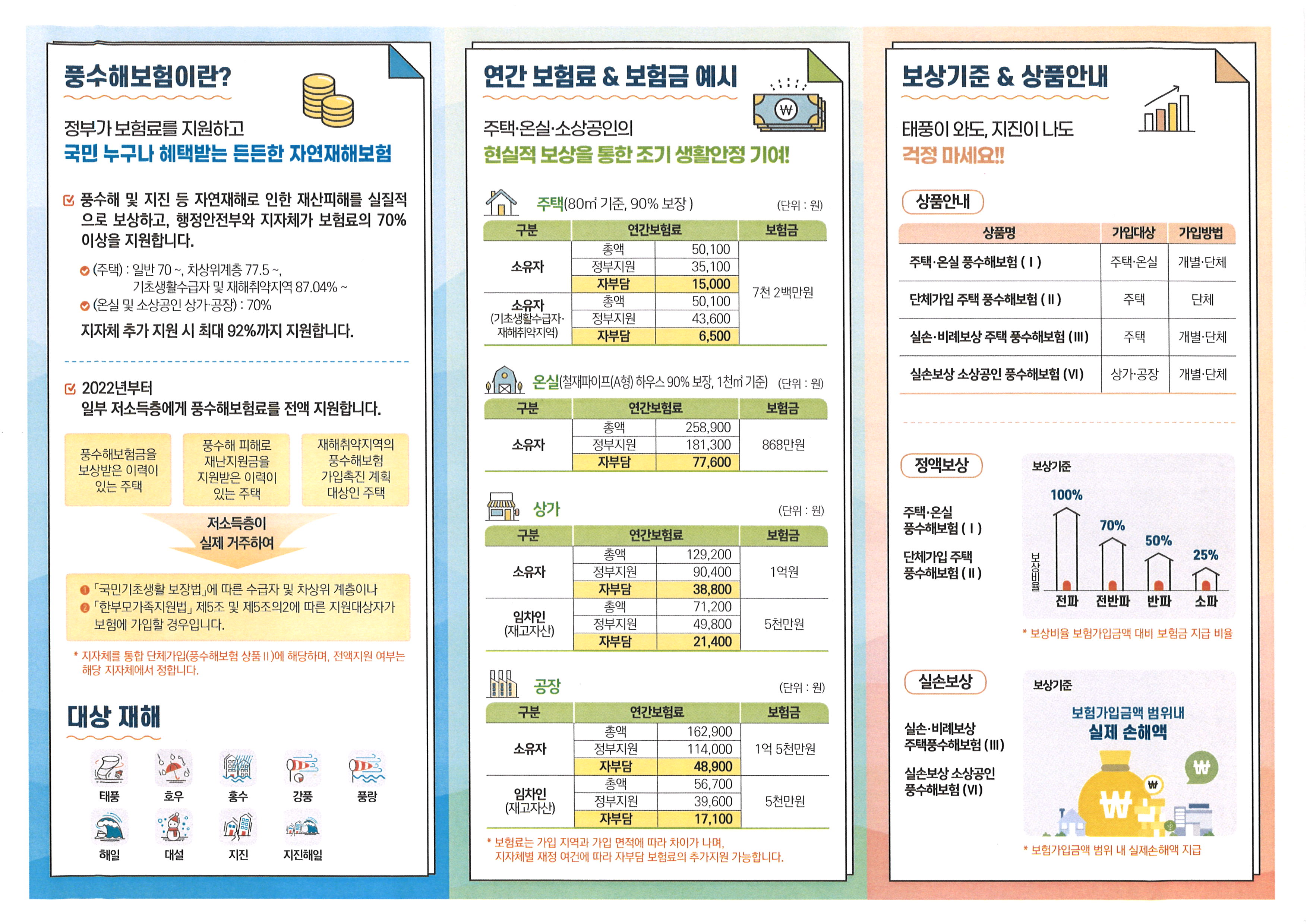 풍수해 보험 : 자연재해로 인한 재산피해를 보상하기위해 정부가 총 보험료의 70% 이상을 지원해 주는 보험입니다.