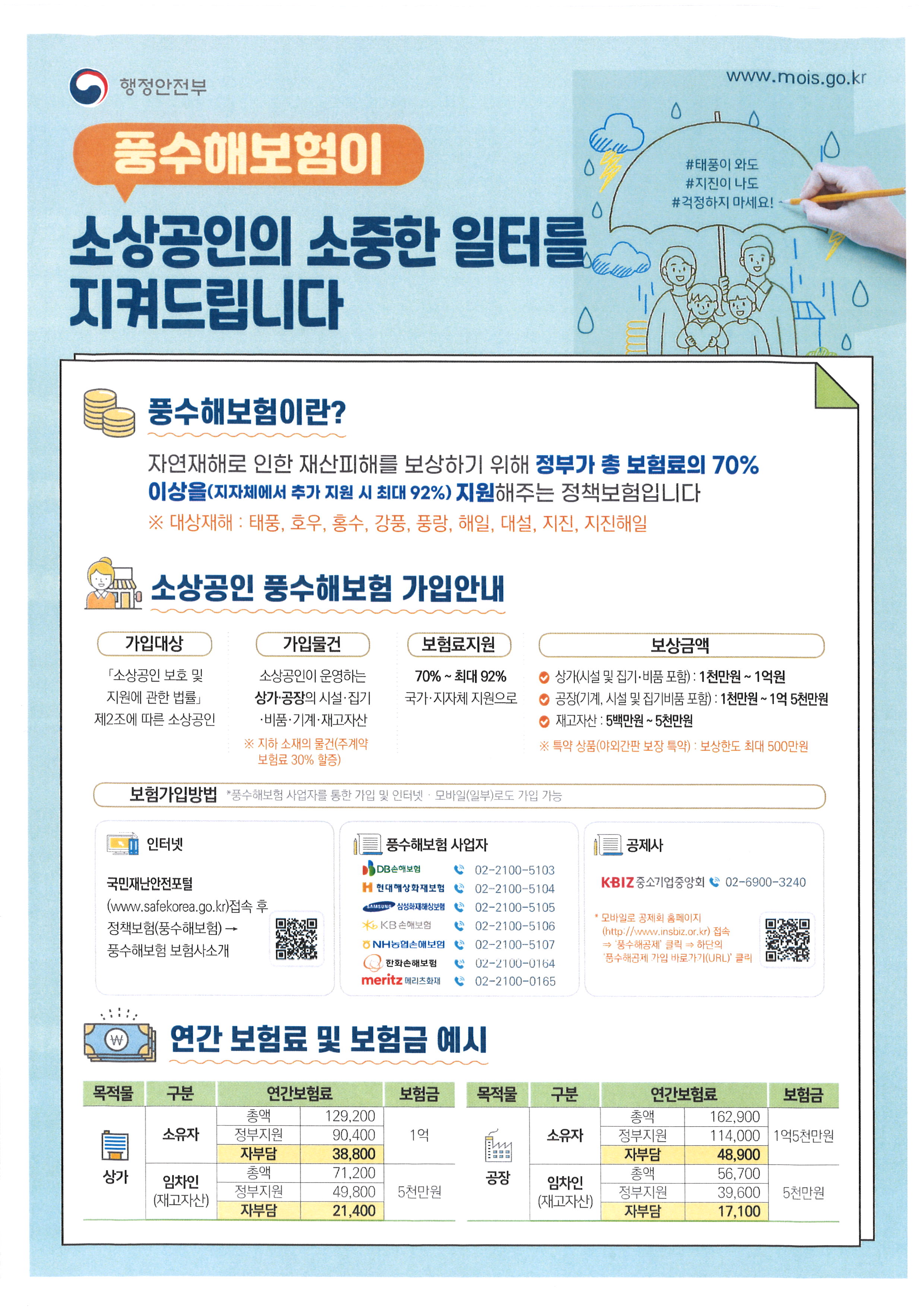 풍수해 보험 : 자연재해로 인한 재산피해를 보상하기위해 정부가 총 보험료의 70% 이상을 지원해 주는 보험입니다.