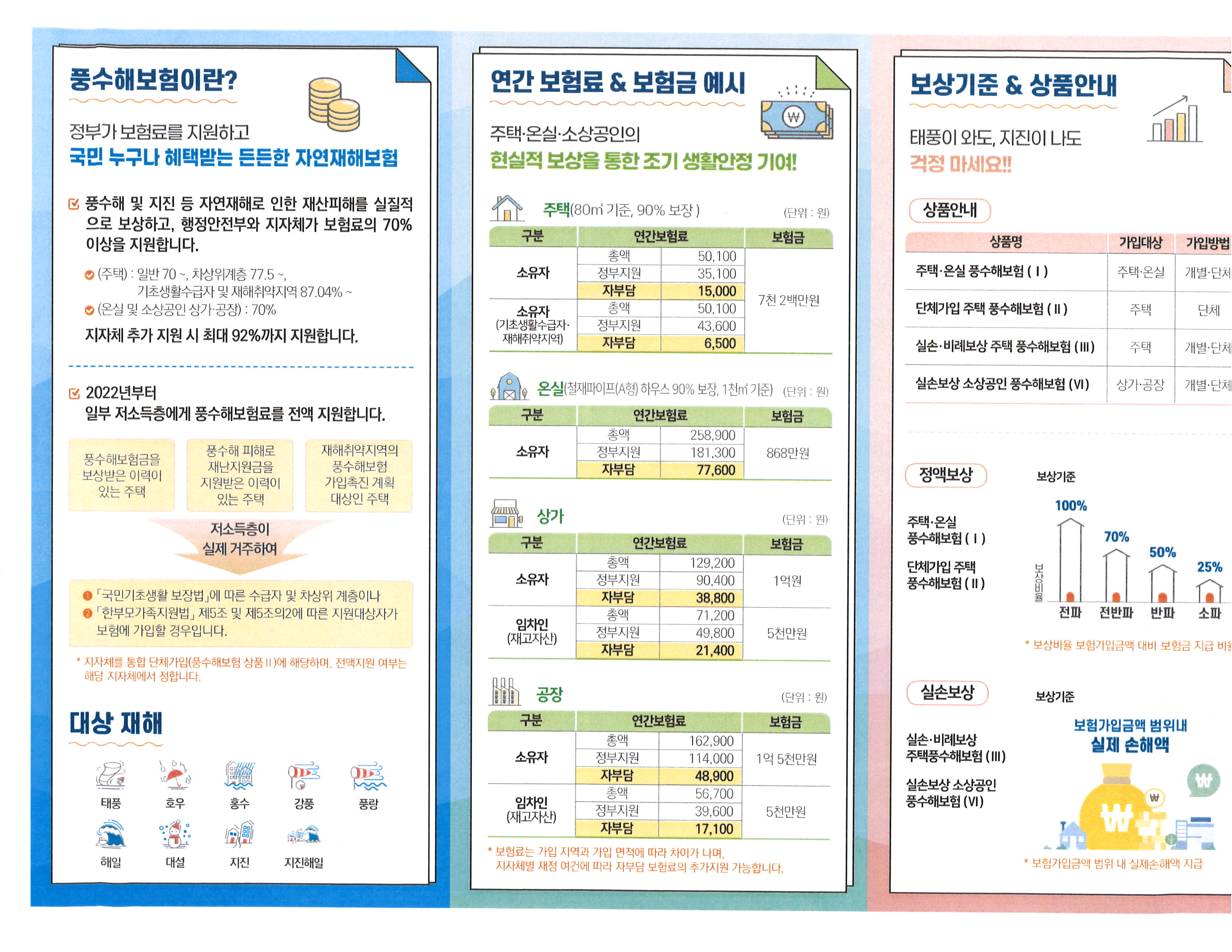 풍수해 보험 : 자연재해로 인한 재산피해를 보상하기위해 정부가 총 보험료의 70% 이상을 지원해 주는 보험입니다.