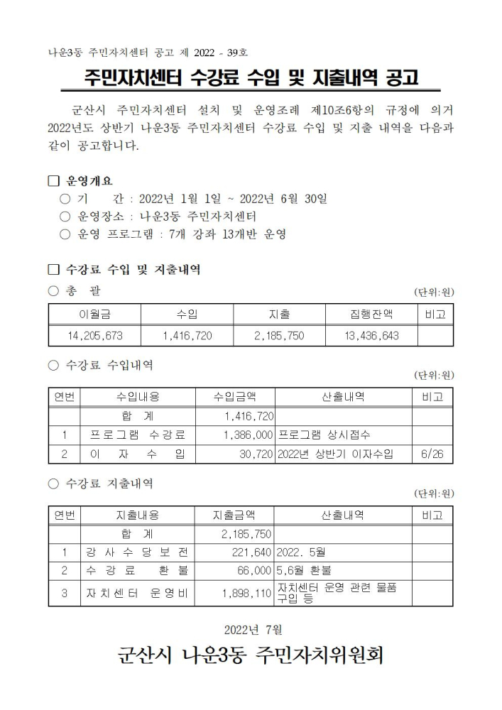 | 11 | 2022년 상반기 주민자치센터 수강료 수입 및 지출내역 공고 |