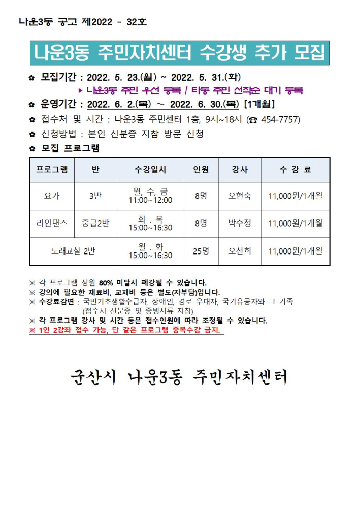 | 9 | 2022년 나운3동 주민자치프로그램 노래교실 강사 모집 공고 |