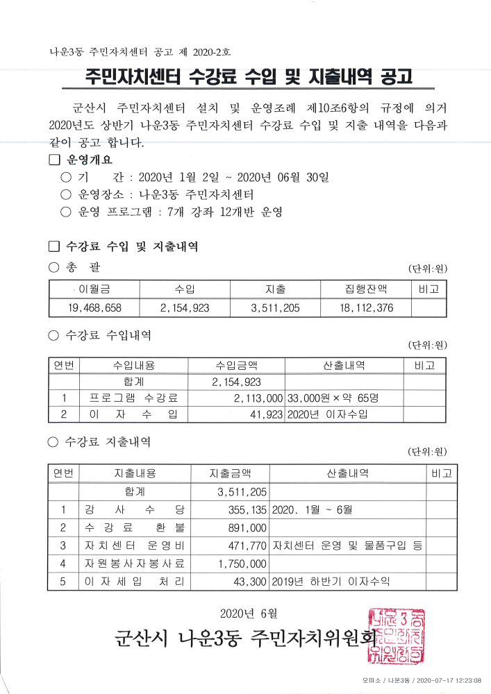 | 5 | 2020년 상반기 주민자치센터 수강료 수입 및 지출내역 공고 |