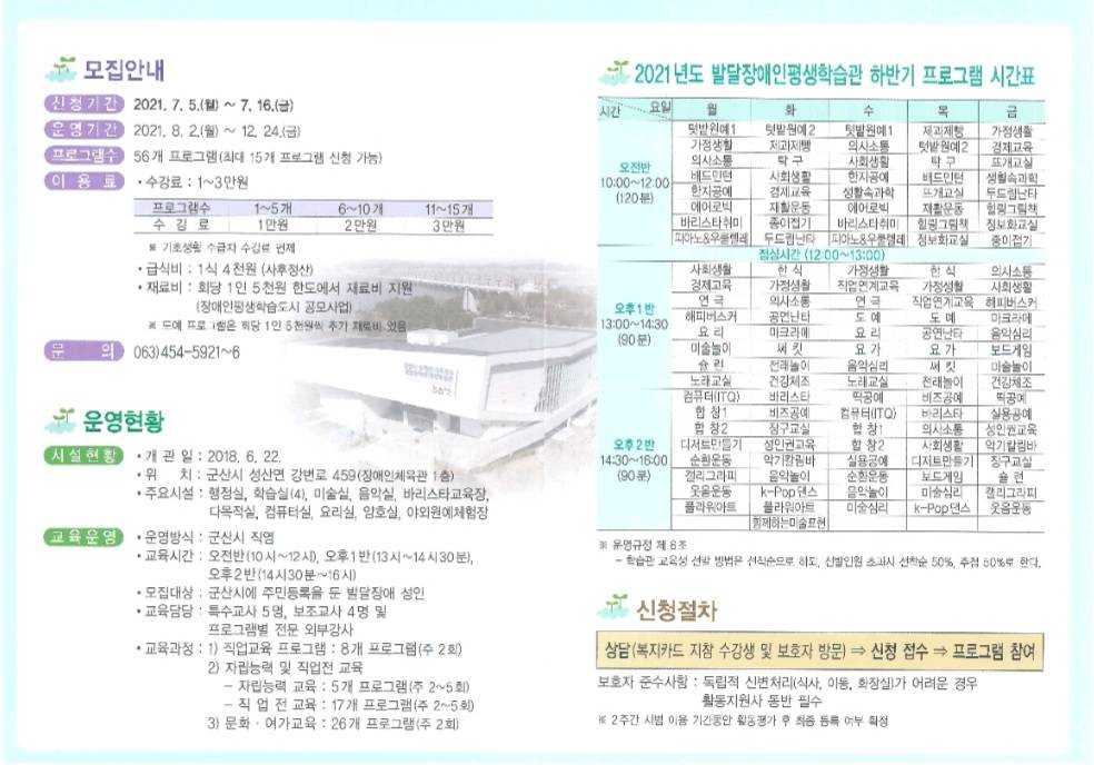 군산시발달장애인평생학습관에서는 성인발달장애인의 자립적 생활과 직업능력 향상 기회를 제공하고자 2021년 하반기『맞춤형 평생교육 프로그램』운영을 위한 발달장애인평생학습관 수강생을 다음과 같이 모집 합니다.