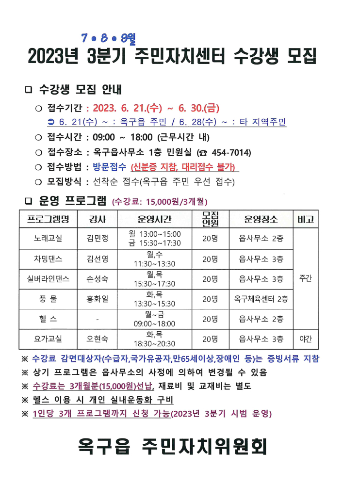 | 32 | 2023년 3분기 옥구읍 주민자치프로그램 수강생 모집 안내 |