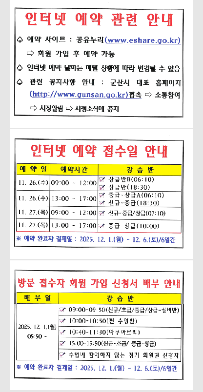 2. 인터넷 예약 접수일 : (성인반) - 2025. 11. 26.(수) ~ 11. 27.(목) / (어린이반 추가 모집 없음)*첨부 파일 참조
