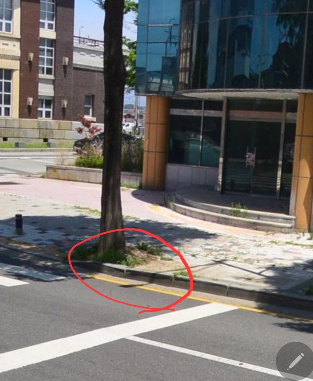 사진을 보시면 군산근대건축박물관 횡단보도 구역입니다. 도로가 갑자기 좁아지면서 굽어 있어 사고가 나기 쉬운지역입니다. 이미 인도 경계석에 차바퀴가 부딪힌 자국이 있습니다. 여기 도로를 넓고 직선으로 개선부탁드립니다.