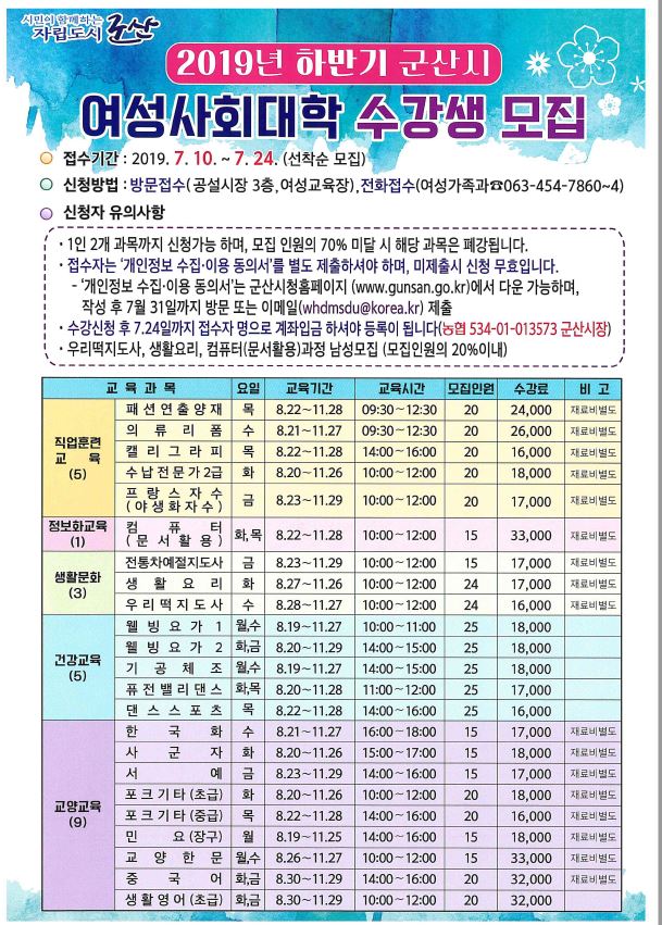 | 130 | 2019년 하반기 군산시 여성사회대학 수강생 모집안내 |