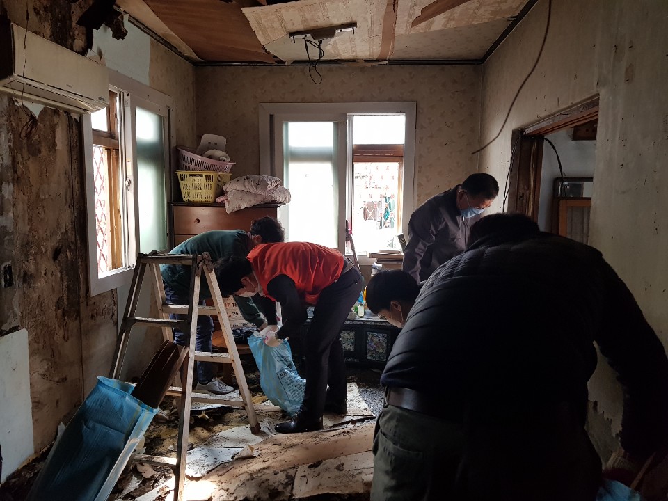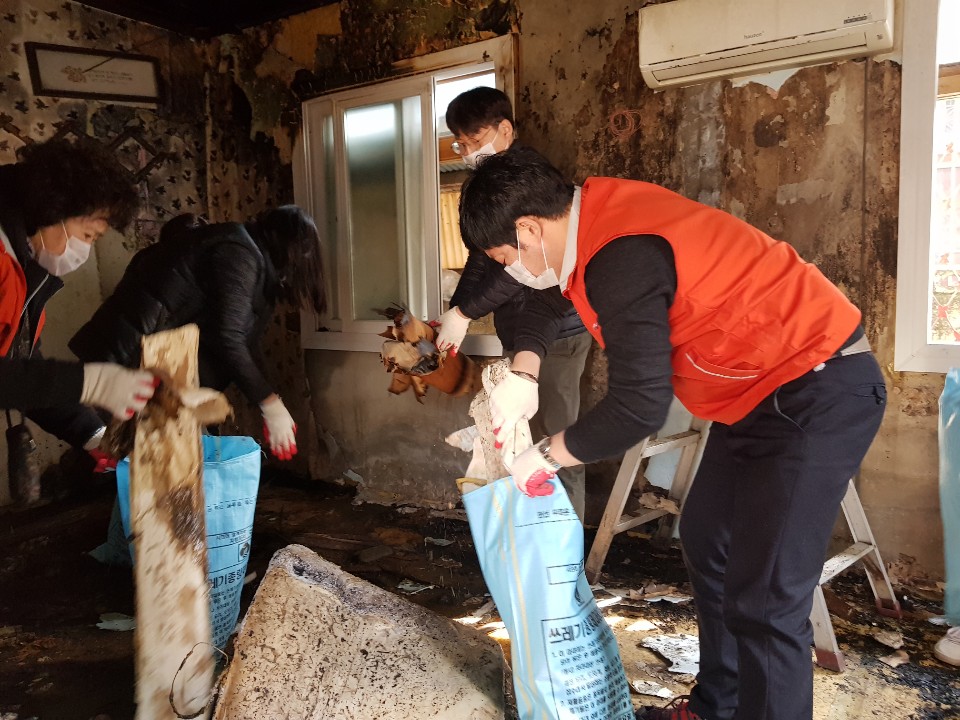 홀몸어르신 댁을 찾아 그을리고 물에 젖은 세간살이를 같이 정리하며