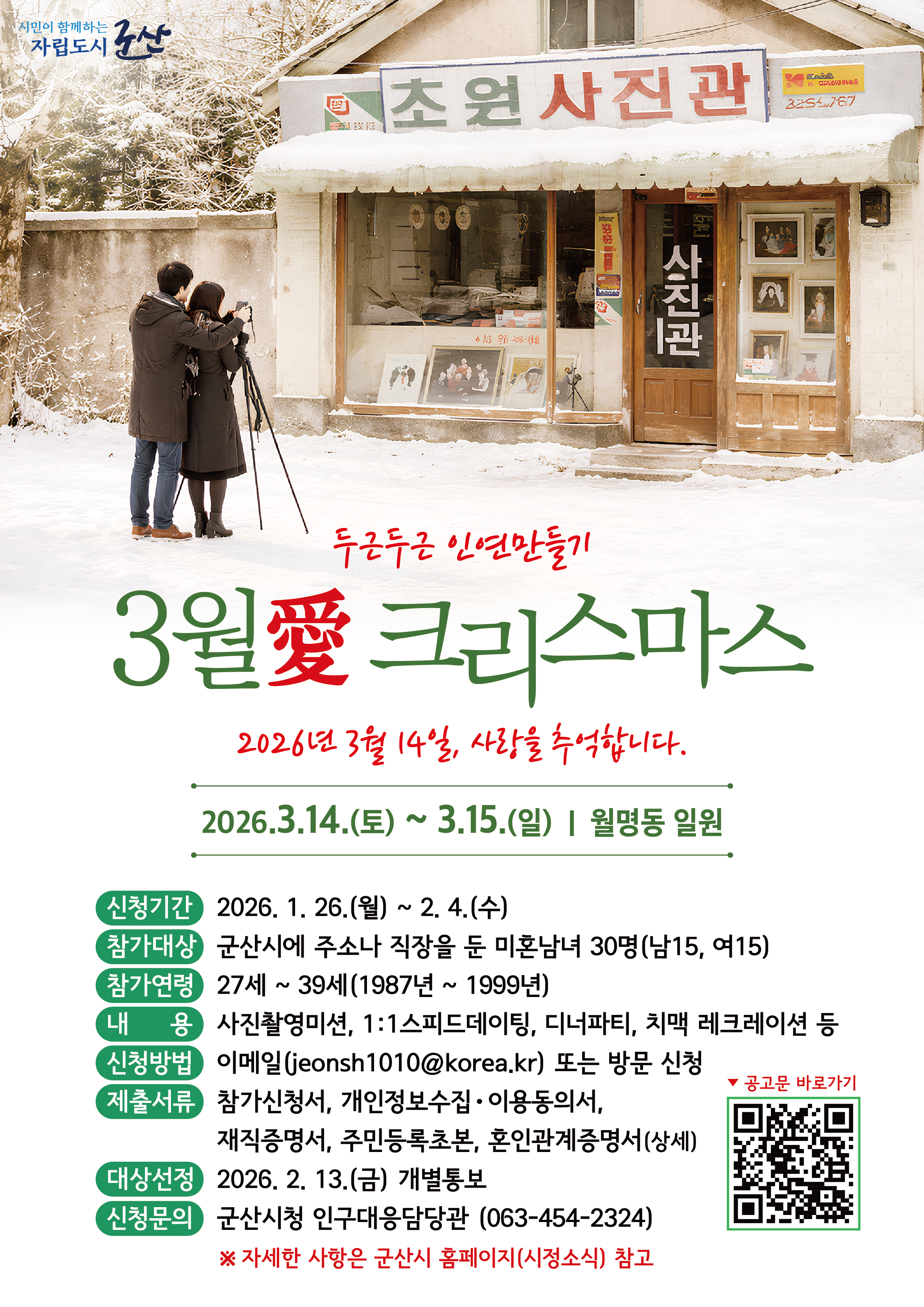 군산시에서는 바쁜 일상 속 미혼남녀의 자연스러운 소통과 교류의 장을 마련하여 연애·결혼에 대한 긍정적 인식을 제고하고 결혼 친화적 분위기 조성을 위해 군산시 두근두근 인연만들기 [3월 愛 크리스마스] 참가자를 모집하오니 많은 관심과 신청 바랍니다.