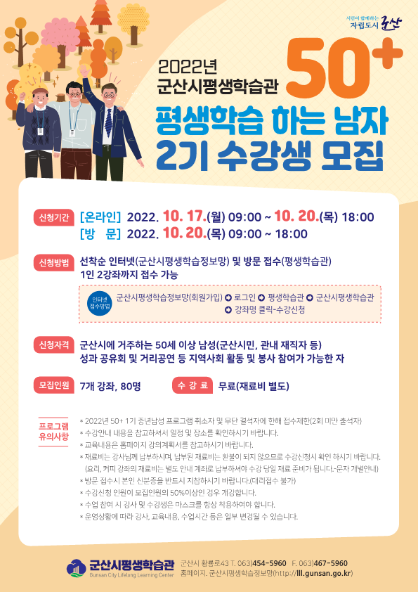 2. 신청방법 : 선착순 인터넷(군산시평생학습정보망) 및 방문접수(평생학습관)