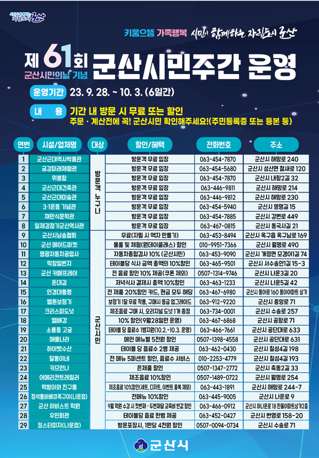제61회 군산시민의날 기념 군산시민주간 운영 시설 및 업체를 안내합니다.