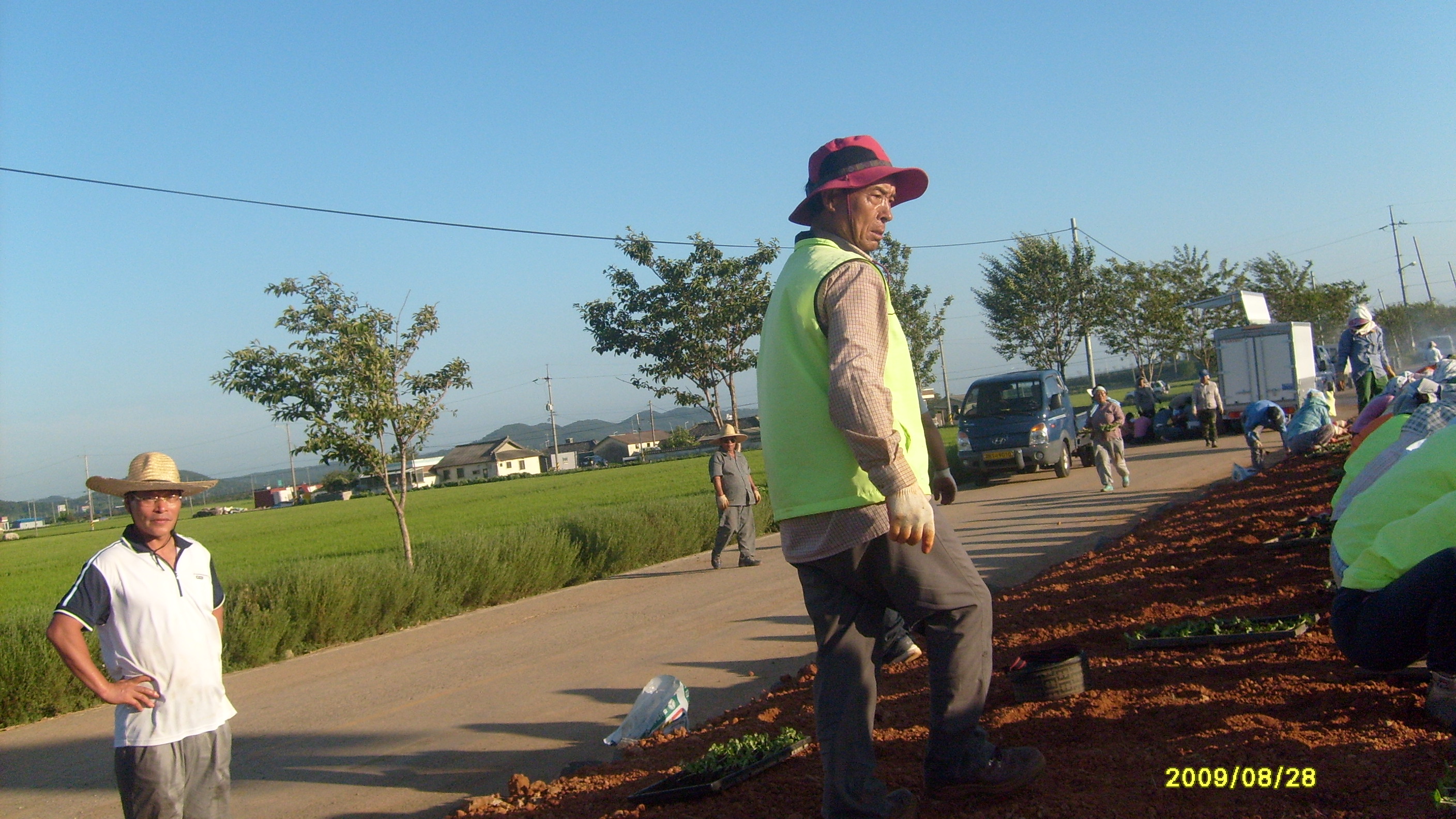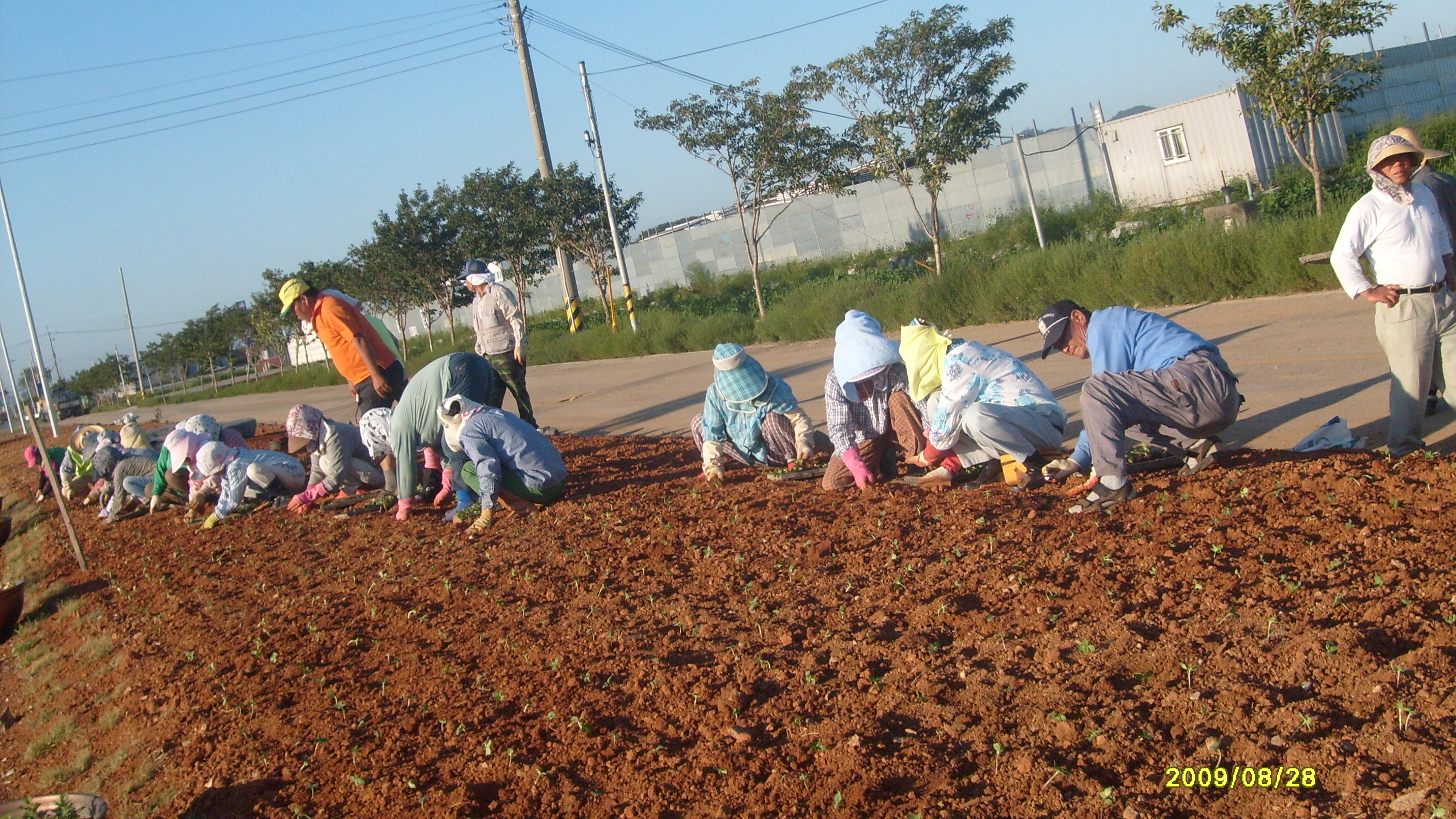 미성동/산북동 통장단과 부녀회 여러분 감사합니다. 2009년8월28일은 공항가는 도로에 해바라기를 심었어요. 전날에 우천관계로 일을 중단하고 어제는 바쁜 일과였지요. 그래서인지 노인일자리 하시는 분들과 우리 희망근로자 분이 모두 동참했지요. 일부는 포크로 모종을 빼고 일부는 심고 일부는 물 뿌리고 많은 인원이 투입됐지요. 근데 갑자기 녹색 조끼를 착용하신 분들이 보이는 겁니다. 누구냐고 물었더니 산북/미성 통장단과 부녀회에서 도와주러 나오셨더라구요. 구의원이셨던 이덕영님도 보이시고 현의원이신 요섭님도 자리를 같이 하셨어요. 이렇게 우린 어우러져 재미있게 일을 마무리 지었답니다. 주말이라 연장 작업은 했지만 쎈터에서 보내준 간식을 맛있게 먹고 안전하게 귀가 즐거운 하루였답니다. 아침부터 물세례 받으며 작업을 통괄해주신 동장님 그리고 일일이 열거는 못하지만 직원분 공익근무원들 통장 부녀회 모두 감사드리며 마을을 위해서 수고 많이 해 주세요.