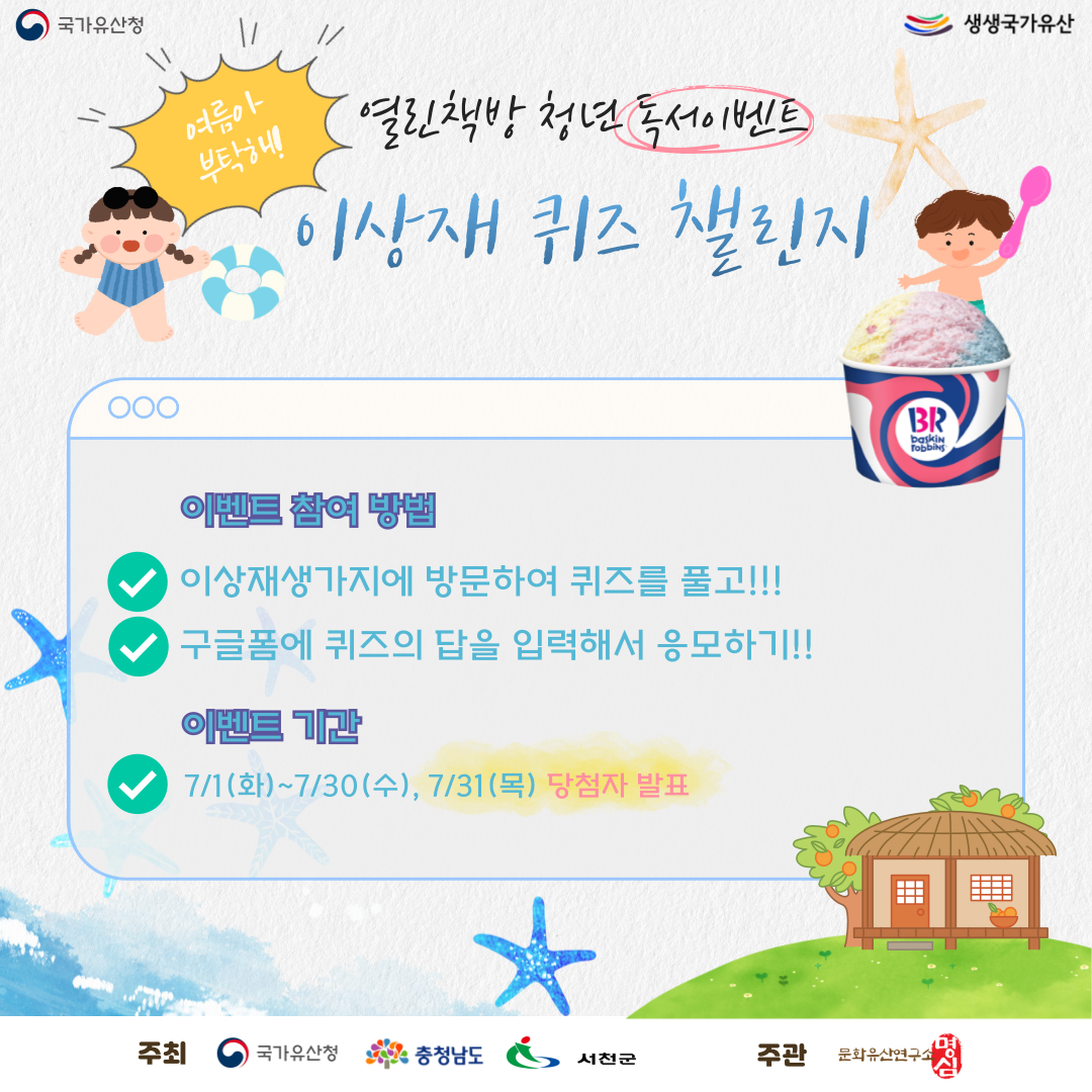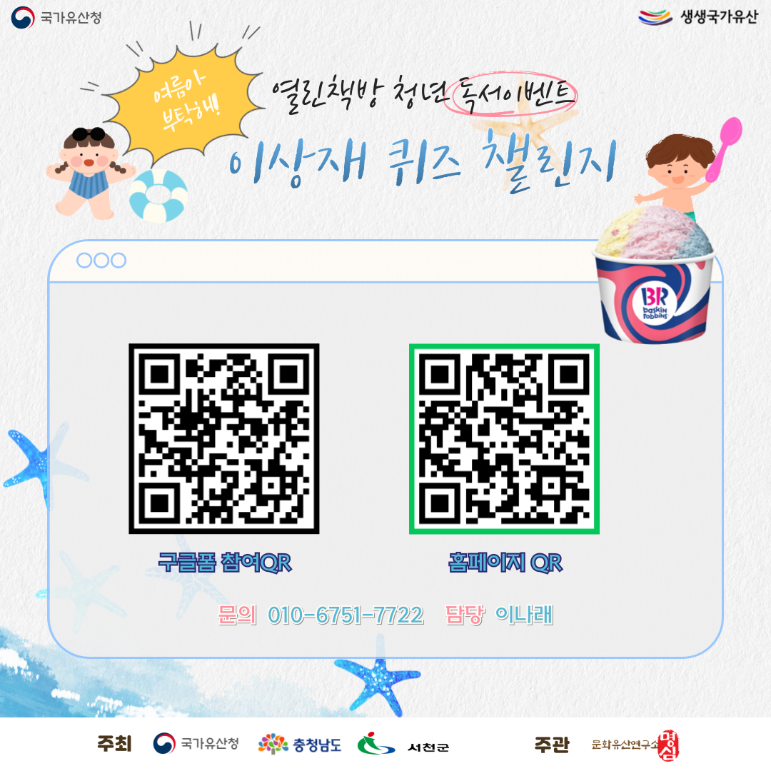 **이상재선생생가지, 열린책방 청년 7월 독서이벤트**이상재선생생가지 전시관에 방문하시면 현장에서 즐기는 특별 퀴즈 체험도 준비되어 있습니다!전시관을 둘러보고, 곳곳에 숨겨진 정답을 찾아 직접 퀴즈를 풀어보는 즐거운 시간!퀴즈도 풀고, 재미있는 체험도 즐기고!!정답을 맞히면 시원한 선물을 드립니다!전시관에서 힌트를 확인하시고 퀴즈 검색도 가능합니다!여름날, 이상재선생생가지에서 만나는 시원한 역사 여행, 지금 함께 해보세요!신청링크https://docs.google.com/forms/d/1ARfH8h_XoASDszh3jbO5h1wN9PYkzrLuTbGg6bJDMXc/edit