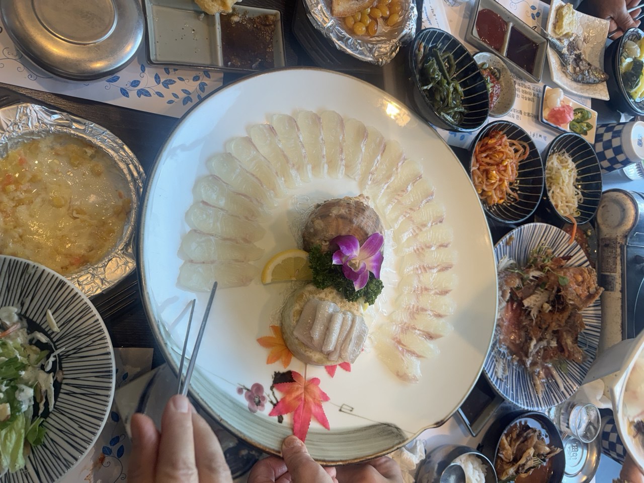 단체예약임에도 불구하고 이 중 한 음식점은 음식의 품질과 구성이 우수하여 만족도가 높았습니다.