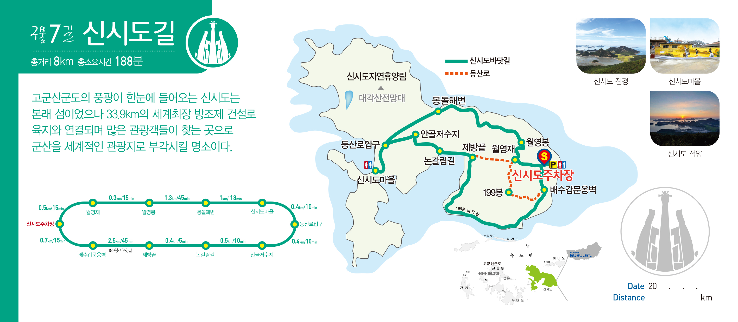 총거리 8Km 총소요시간188분고군산 군도의 풍광이 한눈에 들어오는 신시도는 본래 섬이었으나 33.9km의 세계최장 방조제 건설로 육지와 연결되며 많은 관광객들이 찾는 곳으로 군산을 세계적인 관광지로 부각시킬 명소이다.