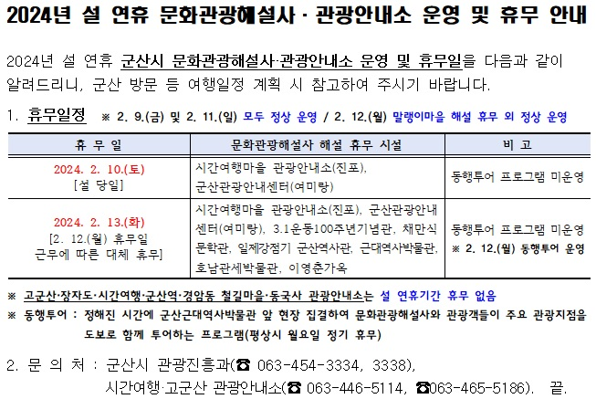 | 277 | 2024년 설 연휴 문화관광해설사·관광안내소 운영 및 휴무 안내 |