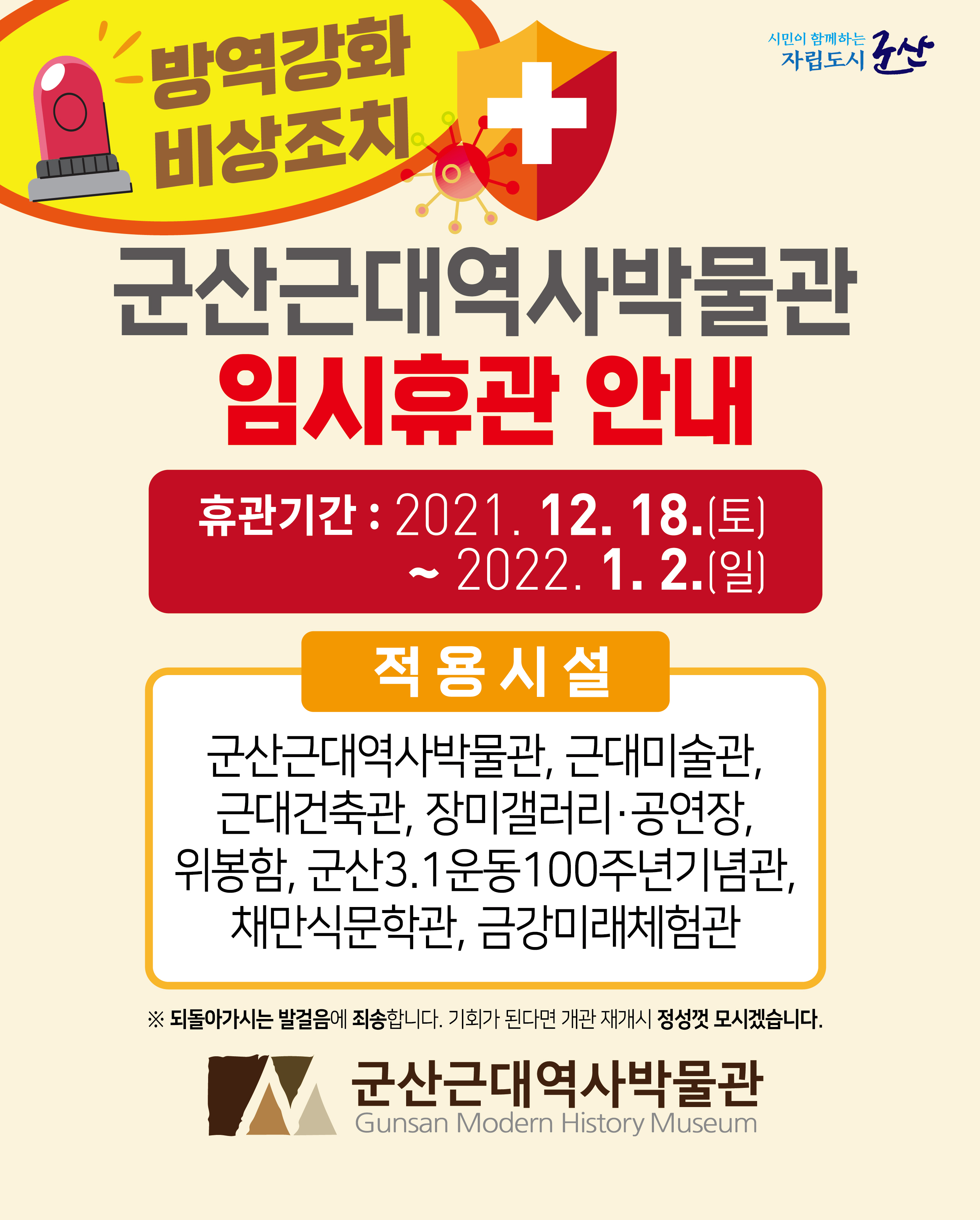 코로나 19 확산 방지를 위해 군산 근대역사박물관 휴관 (2021, 12 ,18~2022 ,1, 2 )