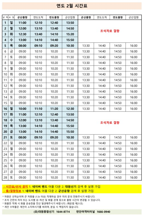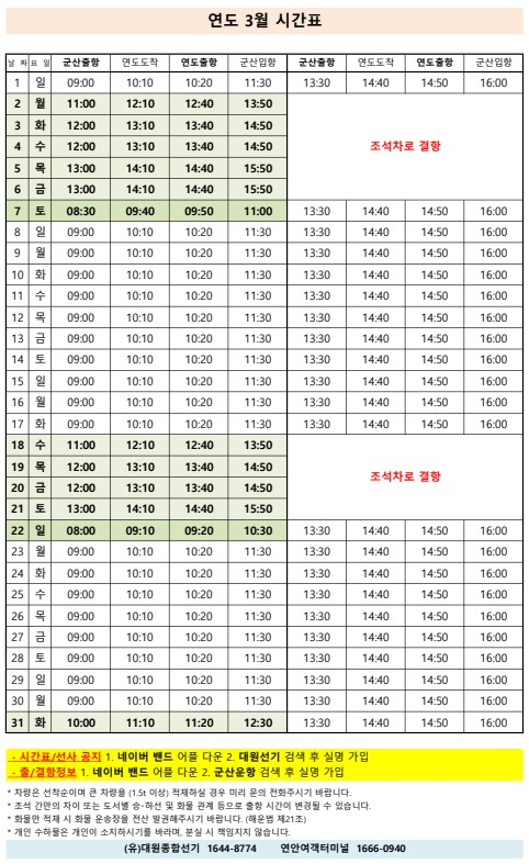 고군산 군도 섬여행 선박 운행 시간표 안내입니다.
