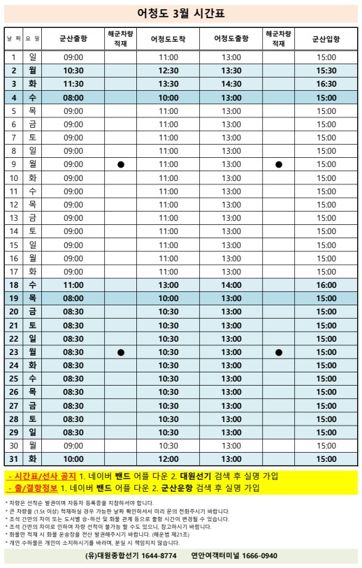 여객선 안내 -군산 연안여객터미널 (유) 대원종합선기 1644-8774 (임해로 378-8)(어청도 개야도 연도)