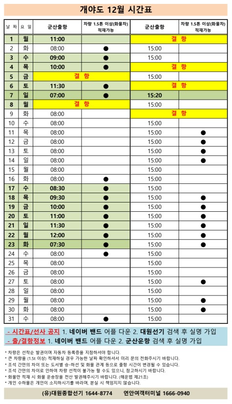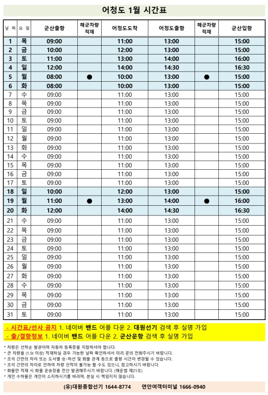 여객선 안내 -군산 연안여객터미널 (유) 대원종합선기 1644-8774 (임해로 378-8)(어청도 개야도 연도)