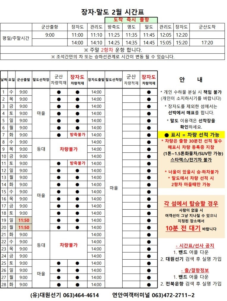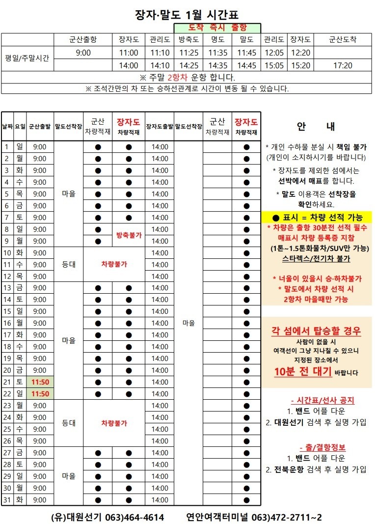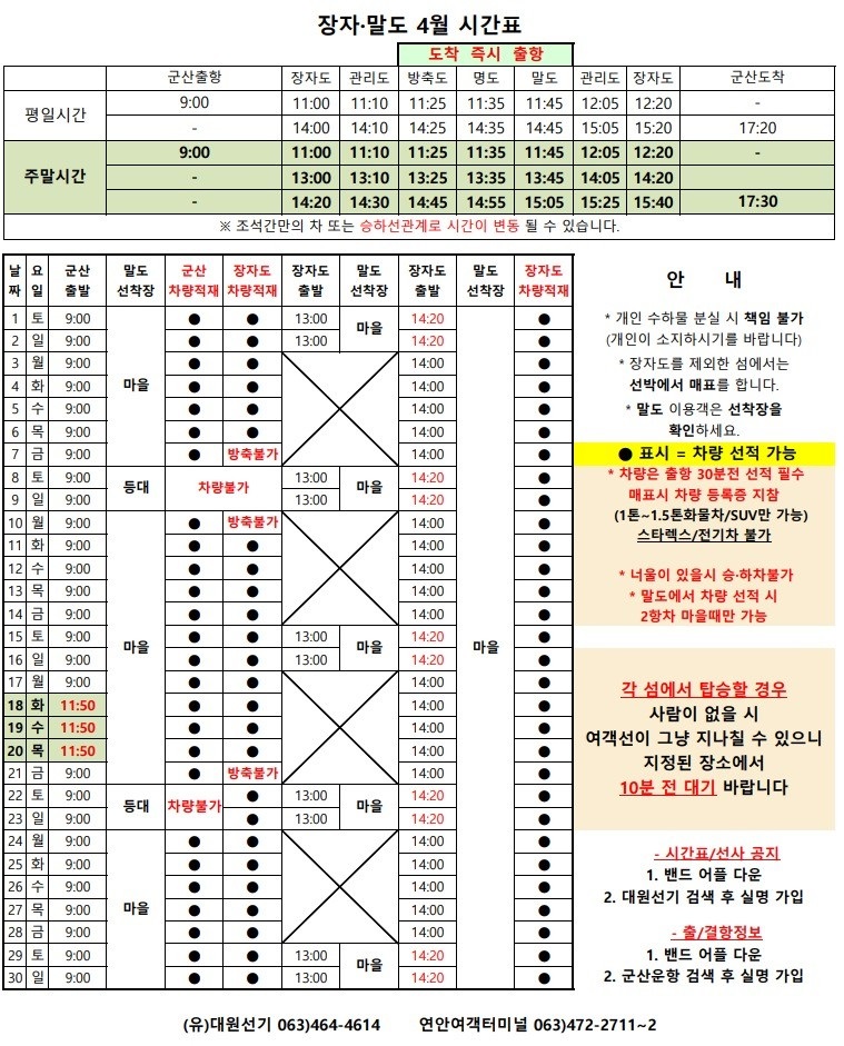 고군산 군도 섬여행 선박 운행 시간표 안내입니다.