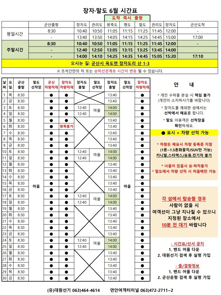 여객선 안내 -군산 연안여객터미널 (유) 대원종합선기 1644-8774 (임해로 378-8)(어청도 개야도 연도)