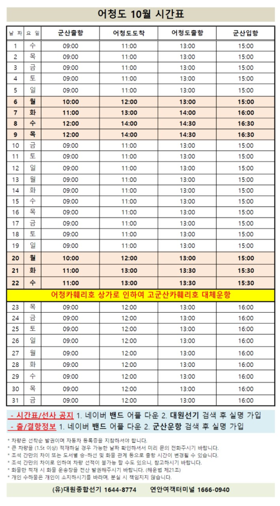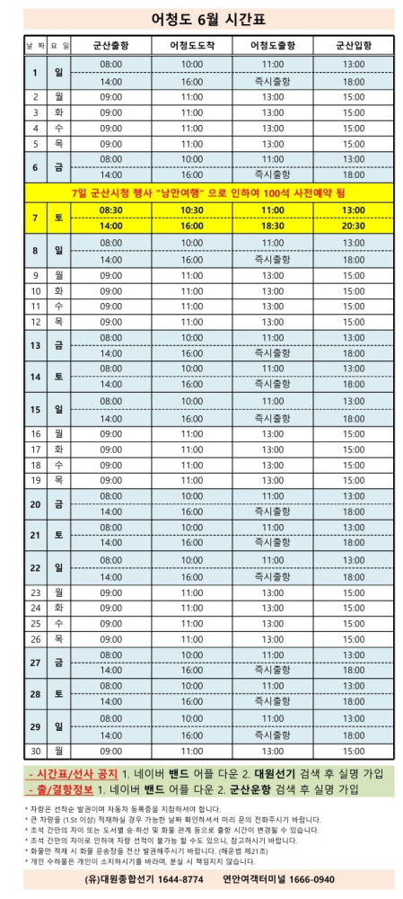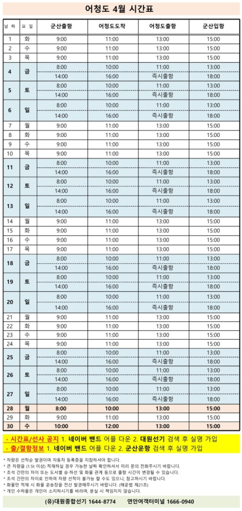 여객선 안내 -군산 연안여객터미널 (유) 대원종합선기 1644-8774 (임해로 378-8)(어청도 개야도 연도)