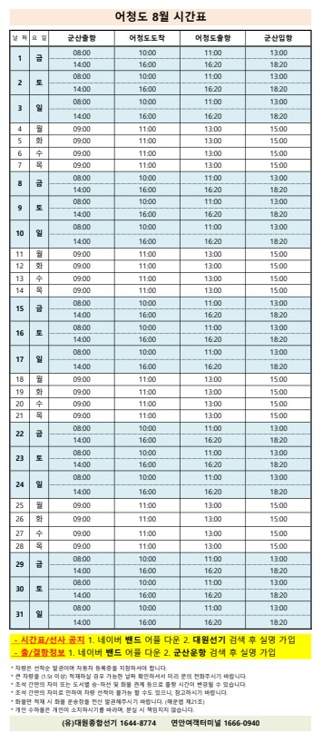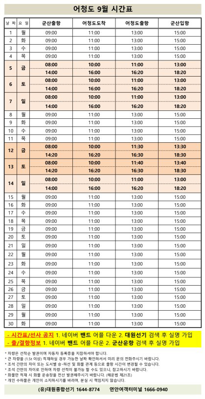고군산 군도 섬여행 선박 운행 시간표 안내입니다.