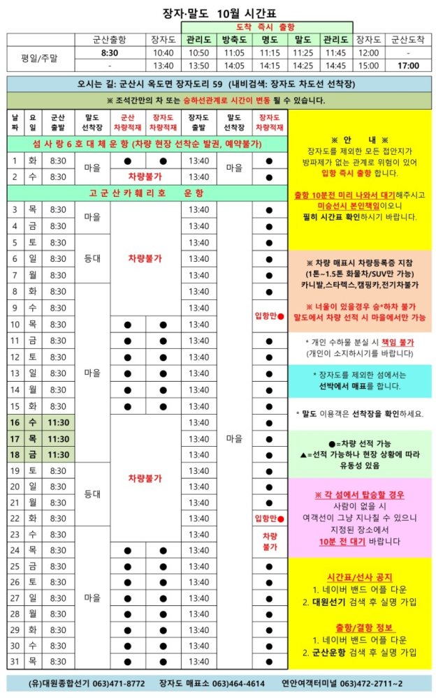 고군산 군도 섬여행 선박 운행 시간표 안내입니다.