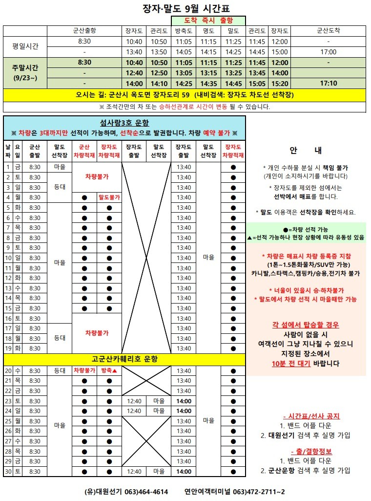 방축도 9월 여객터미널 시간표 알림