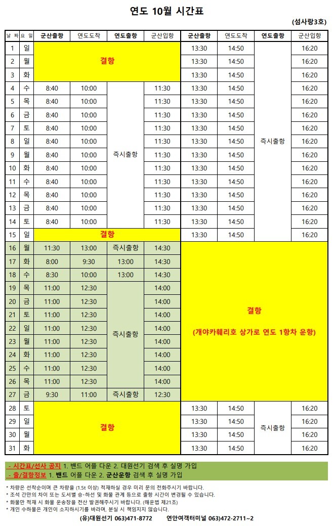 개야도 10월 여객시간표 알림